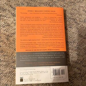 Guns, Germs, and Steel by Jared Diamond. Paperback edition with a beige and black cover.