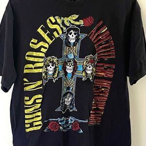 Used, in excellent condition. No visible flaws. See pics, ask questions. Black t-shirt with Guns N Roses Appetite for Destruction on the front. Cross with skulls. Size XL, approximate measurements: 22" pit to pit, 29" length.