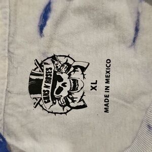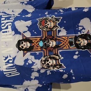 This is a men's XL size blue short sleeve T-shirt by the brand Guns N' Roses. The shirt features a tie-dye design with the band's "lartwork. Made of cotton, this regular fit shirt has a crew neck neckline and is suitable for fans of rock music and the band GNR. Manufactured in Mexico, this T-shirt is a stylish addition for those who appreciate classic rock fashion.