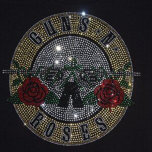 Show off your fun style in this first quality custom made to order rhinestone bling shirt featuring a very large Guns N Roses design with LOTS of sparkling multi colored rhinestones. Fabulously fun design!