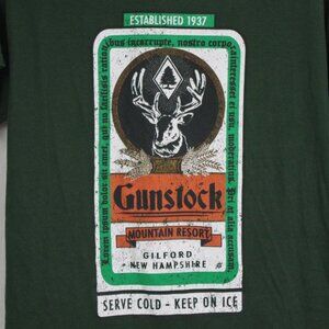 This listing is for a Gunstock Mountain of Gilford New Hampshire T Shirt. It has a Jagermeister themed logo and was printed on a 100% Cotton Ouray dark green shirt.