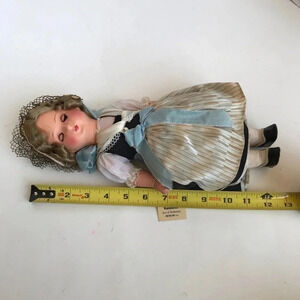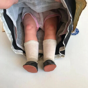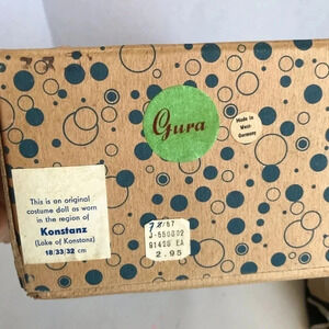 Original 1950’s Gura doll dressed in original Konstanz costume. The eyes open and close. The head and arms appear extremely fragile from age, wobbly- if that makes sense. Eyelashes are disintegrating. She measures approximately 12” tall. She has wear from just being in storage, but was never played with. I am not a doll expert so please refer to pictures and let me know if you have any additional questions.