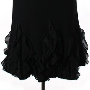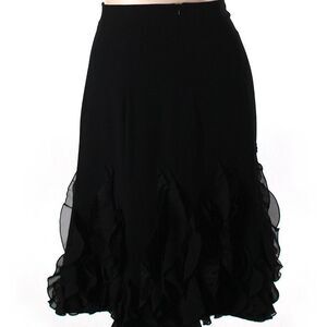 Dress up with all the bells and whistles in this sophisticated ruffled hem skirt in elegant solid black. A-Line silhouette. Zipper back closure. 100% Polyester. Size 14. 31" Length. Waist measurement is 18 inches laying flat and taken from the front. This gorgeousness is in excellent condition. You might mistake it for brand new! BD12K