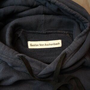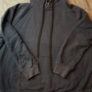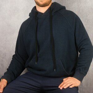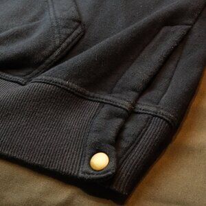 Details: Navy blue with a kangaroo pocket, ribbed cuffs, and hem. Features brass snap detail at the sides and long drawstrings.