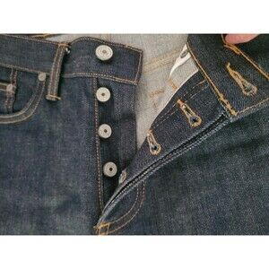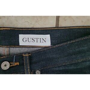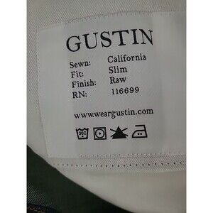 The Gustin Jeans Men's 31 X 28 Dark Wash Slim Raw Straight Denim Button Fly is a high-quality pair of jeans made from durable cotton denim in a solid dark wash color. Featuring a slim fit and straight leg style, these jeans are designed for a comfortable and stylish look. The button fly and 5-pocket design add practicality to the classic denim design, making them a versatile option for any season. They are in excellent preowned condition with no rips or stains.