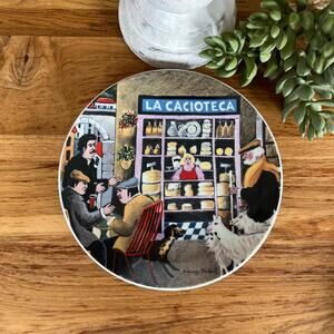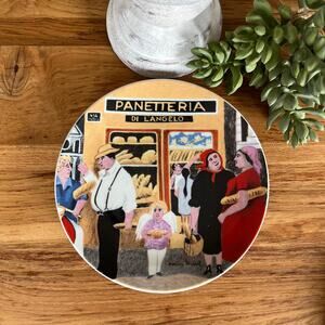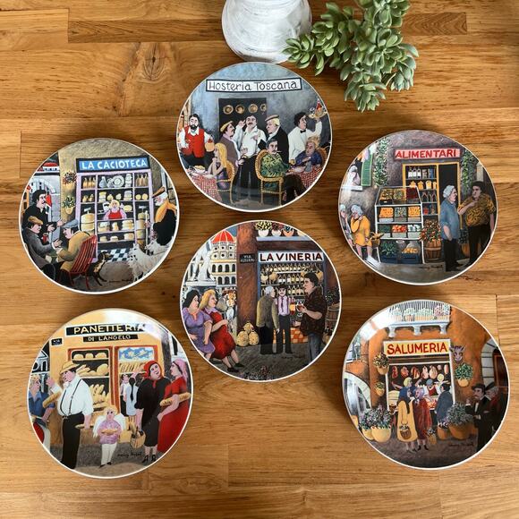Estimated circa early 2000s, this vibrant set captures the warmth and humor of Guy Buffet’s signature style. Microwave and dishwasher safe, they are as functional as they are whimsical. Whether you're entertaining guests or displaying them as art, these plates bring a touch of Tuscany to any occasion.