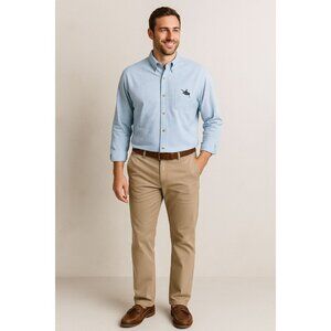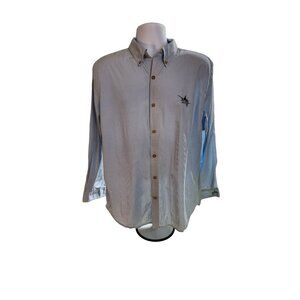 This Guy Harvey men’s button-down shirt (size Large) is crafted from 100% cotton in a light blue micro-check pattern. Features embroidered marlin logo on the chest and cuff, button-down collar, and long sleeves. A versatile coastal-inspired shirt, perfect for fishing, casual wear, or smart-casual outings.