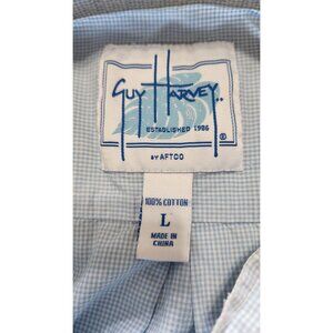 Guy Harvey Button Down Shirt L Blue Cotton Check Marlin Logo Coastal Fishing