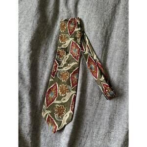 Vintage Guy Laroche necktie in a bold floral paisley print with rich earth tones—olive green, burgundy, tan, and blue. Made in the USA of 100% silk. Great condition with no visible flaws. Perfect statement piece for retro or classic looks.