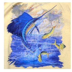 This Guy Harvey t-shirt features a vibrant marine-themed graphic with a marlin and fish. Made of soft, breathable fabric, it offers a comfortable fit.
