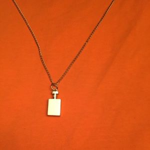 Orange, sleeveless. Check out the gold flask necklace and the portrait back panel.