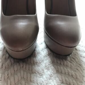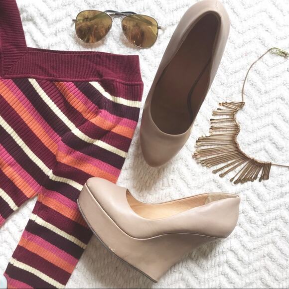 Nude/tan wedges by Gwen Stefani brand “L.A.M.B.” with a platform. This is a shoe to wear if you’re feeling adventurous and risky! They will definitely spice up any outfit. Great condition. Just a couple tiny scuffs (pictured). Leather upper. Size 8.