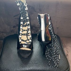 Gwen Stefani black leather shoe string tie up 4.5 ‘ heels. Sz9.5 No issues