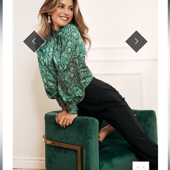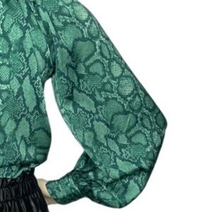 A perfect work top that transitions for desk to drinks. Features a gorgeous green snake print on a matte satin fabric. Wear it to work paired with trousers and loafers, and switch out to heels for a night out.