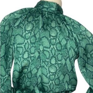 Beautiful saturated green snake print with a 3 button mock neck. Keyhole cutout at neck.