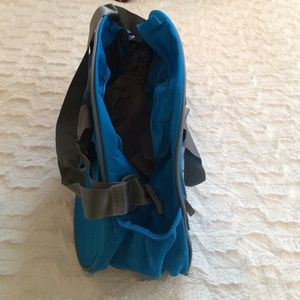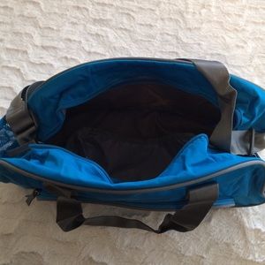 Bright turquoise color with grey liner and handle shoulder strap also, Pockets on inside and zipper pocket on outside with a spot for a water bottle also