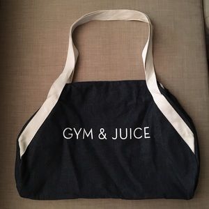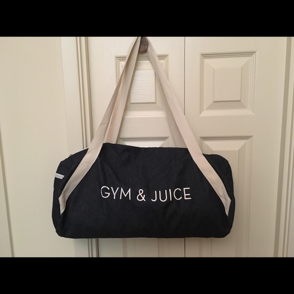 Denim wash “Gym and Juice” duffle with cotton handles. Outside zipper compartment and inner open pocket.