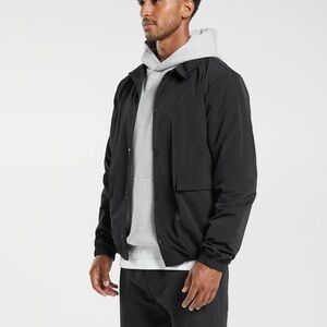 Gymshark Rest Day Commute Jacket. Black nylon, premium snap front, snap pockets, contrast underarm knit panels, mesh woven lining, and an adjustable drawcord hem. Lightweight, minimal, and built for commute + post-gym layering. MSRP $115.