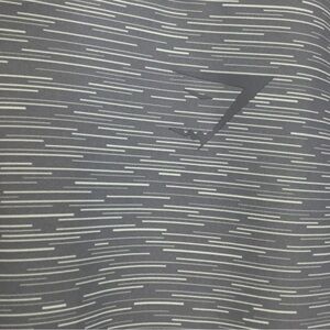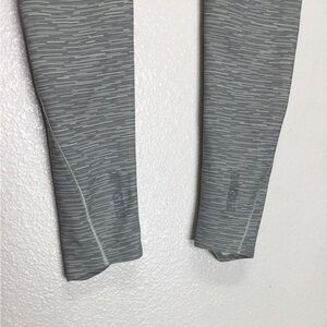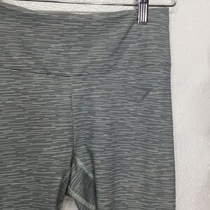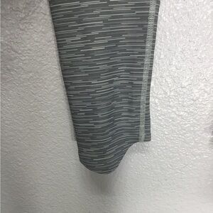 A pair of stretchy workout leggings with 3 little pockets on the waist and a fun scoop bottom on each leg. Pull string on the inside. Grey with thin white and yellow horizontal lines.