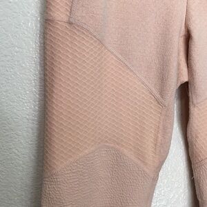 The cutest pair of unique pink work out leggings. Made of a combination of 3 different patterns and materials. Stretchy and soft. 1 side pocket. Bottoms are slightly dirty from hanging and touching the ground- going to wash again to see if it comes off, last picture shows texture of the pants.