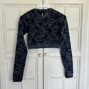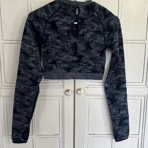 GymShark size medium black camouflage long sleeve crop top in perfect condition. Measures 13” from armpit to armpit when not stretched at all and is 15” long. 3 keyholes down the back.