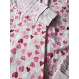 Adorable heart print throughout. Soft light pink background. Red, hot pink and white print. Delicate light pink bow at center of neckline on top. Striped accented sleeves coordinate with colors. Cuffed wrists and ankles. Elastic waistband.