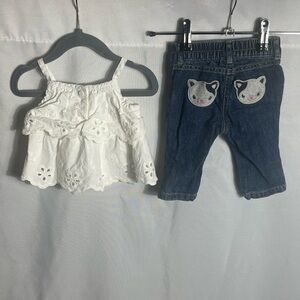 Gymboree Baby Girl 2pc Outfit Set 3-6M White Eyelet Top & Jeans Cat Patches