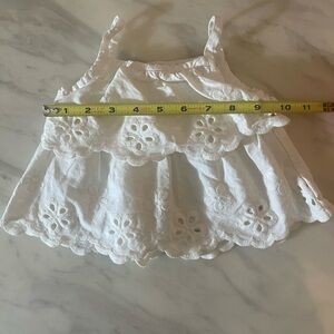 • White cotton sleeveless tiered top with floral eyelet embroidery and scalloped hem.