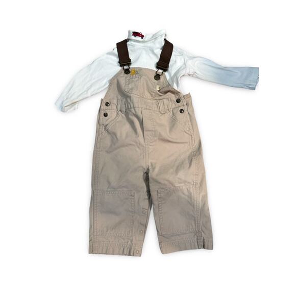 Classic and adorable 2-piece Gymboree baby outfit featuring khaki/brown overalls paired with a white long-sleeve onesie. This timeless set is perfect for everyday wear, family outings, photos, or fall layering. The adjustable shoulder straps and soft fabric make it both comfortable and practical for little ones.