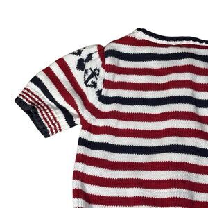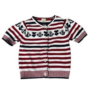 This is an adorable Gymboree "Bon Voyage Striped Anchor Cardigan" in size 4, perfect for a cute and nautical-themed outfit. This short-sleeved cardigan features a classic striped nautical design with an anchor detail and a placket with five buttons.