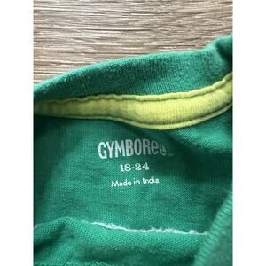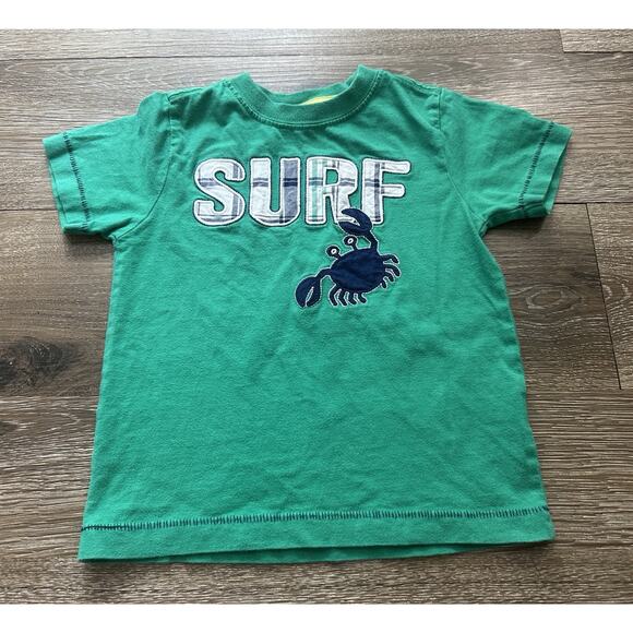 Gymboree boys short sleeve t-shirt, size 18–24 months. Fun surf-themed graphic on green cotton—perfect for summer or beach days. Very good used condition with some wash wear but no stains or holes. From a smoke-free, pet-free home. Combined shipping available!