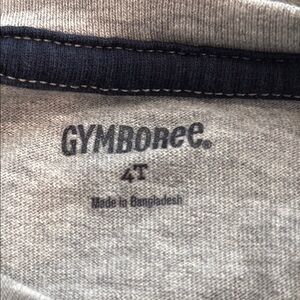 This long sleeve tee from Gymboree features a playful bear graphic on a soft gray body with contrasting blue sleeves. The combination of t-shirt and sweatshirt materials offers a unique layered look, perfect for casual outings. Enjoy the comfort and style of this versatile top.