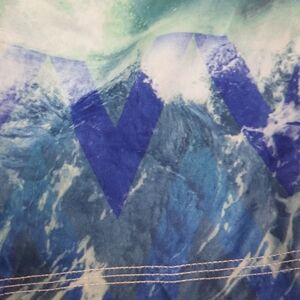 Features elastic waistband, front board short tie, geometric with graphic print of ocean waves, various hues of blue, inside mesh, side velcro pocket.