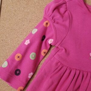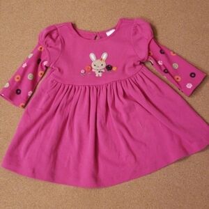 Super cute bright pink dress with bunny applique on front and button print on sleeves