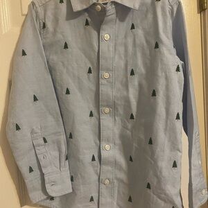 Blue long sleeve button down Oxford shirt with embroidered Christmas trees