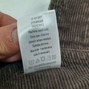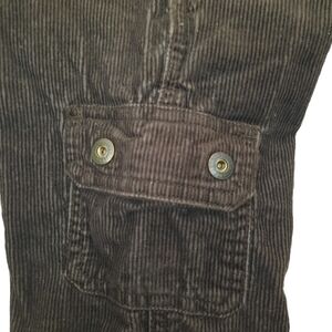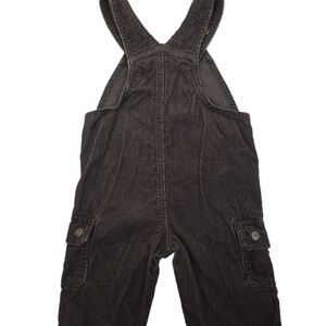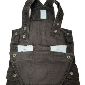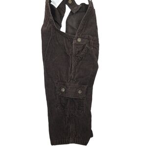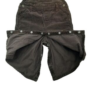 Features dark brown soft corduroy, bib cargo overalls with snap closure with 2 adjustments, adjustable straps, front bib pocket has embroidered baby deer, snaps around legs for easy diaper changing, 2 cargo pockets with bronze snaps, 2 regular slip pockets.