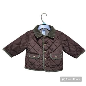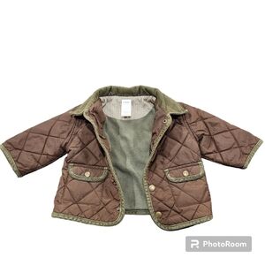 Gymboree Cozy Brown Quilted Jacket With Green Corduroy Trim and some Fleece Lining in the torsos only. Size 6-12mos.