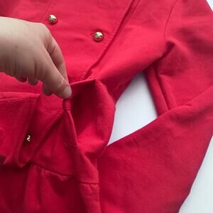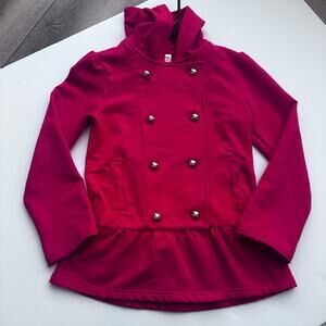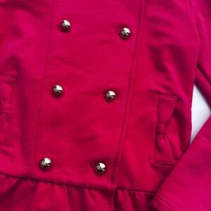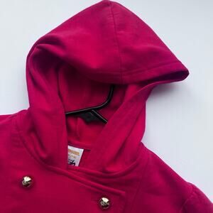 Layer on the color! Stylishly soft fleece jacket features shiny double buttons, attached hood and a sweet peplum hem.