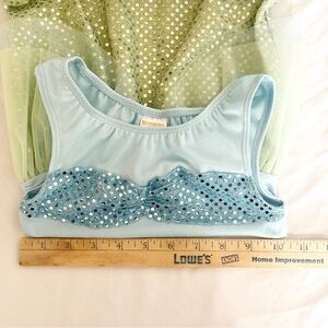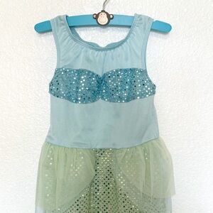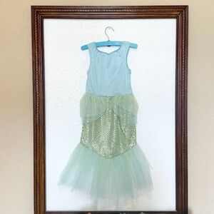 Good Used Condition Gymboree 2012 Girls Magic Mermaid Halloween Dress Up Costume. Excellent details and quality. Shimmery Spandex one-piece with Blue Sequined Faux Shell Bralette, Green Sequined Tail with layers of Blue and Green Tulle for a fin-like flair. Unlined. Pull on for ease of fit. Size XS 3-4. See pictures for additional details. From a smoke-free and pet-free home.