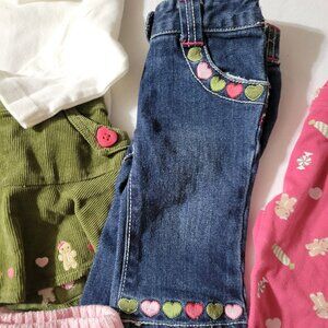 Gymboree Gingerbread Girl Used 3-6 & 6-12 month Lot. 6-12 month bodysuit & corduroy pants, the rest 3-6 month. 0-6 month tights are NWT. Green skirt has diaper cover and is NWT, sweater skirt is NWT. Added another bodysuit VGUC 6-12 month. Located A21, 1 bodysuit in A23