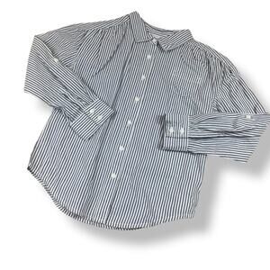 Button-tab styling and rolled up sleeves offer a great twist on preppy fashion. Sweet cotton poplin design features classic stripes while front pocket and a back pleat finish the look.