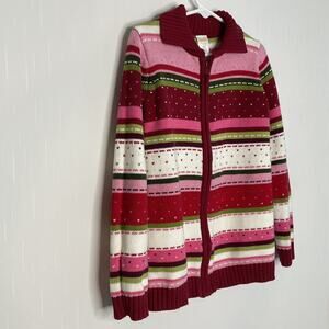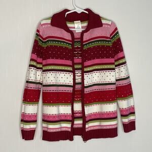 Very good used condition. Cozy Owl Line, adorable fair isle long sleeve cardigan sweater. Multiple colors with greens, pinks, reds and cream. Full zip, collar, ribbed collar, cuffs and hemline. Stripes, polka dots and hearts. No stains or holes noted. Very minor wear, slight pull at shoulders. Measurements in pictures size s 5-6, smoke free home