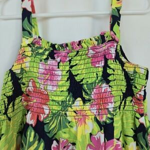 Brighten up your little one's wardrobe with this vibrant Gymboree tropical floral dress. Featuring a delightful mix of pink, green, and yellow hues, it's perfect for sunny days and special occasions. Sleeveless dress features an allover tropical print, smocked bodice with ruffle trim, top lined in 100% cotton batiste, knee length, ruffle hem, back button closure, 52% linen 48% rayon fabric blend.