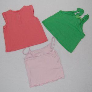 All tops have been loved by my niece! They are in great used condition. Aloha shirt has a small stain on the front bottom right side. The green sleeveless top is in excellent condition. I think the light pink undershirt top with straps was used the most by my niece. This top was originally a size 3-4, but it's been washed several times and shrunk overtime.