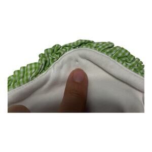 Cotton floral baby blanket with green gingham ruffle edge from Gymboree. Preowned with light by staining and dye transfer throughout. Please see pictures.