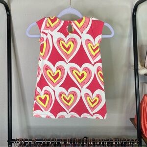 Size 5. Short cap sleeves. Keyhole detail in the back. White, pink, & yellow heart print. A line cut.
