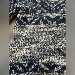 Navy blue and white/ivory shawl collar sweater. Button detail at neck. Soft and cozy thick knit.
