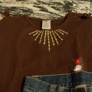 SIZE 3 STRIPED SHIRT & CLAMDIGGER, SIZE 4 BROWN TOP