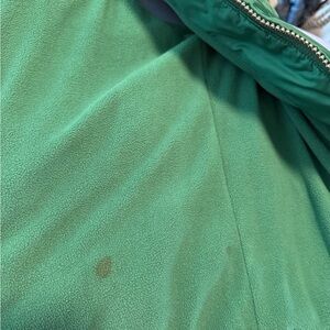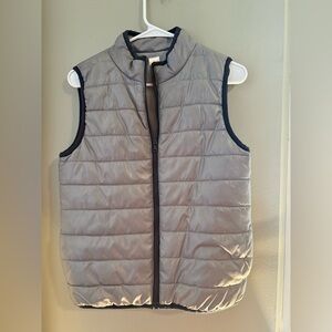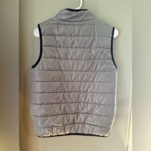 Stylish silver and green puffer vest. Features a front zipper. Perfect for layering.