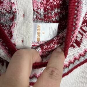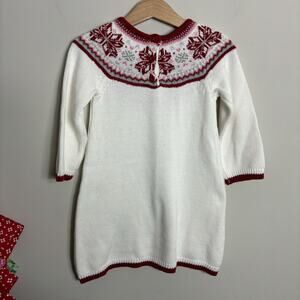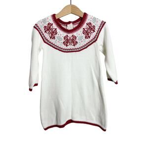 Cream knit dress with snowflakes around the collar. Size is 2T months, GUC for wash wear/piling and small spot on the front as shown.